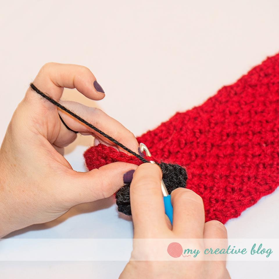Row 6: Join belt to earwarmer in front loop of RS (back loop when holding WS of belt to WS of earwarmer to join) on beginning ch of earwarmer, ch 1, turn, sc in each st working through both loops of hdc on belt and front loop on earwarmer. (8)