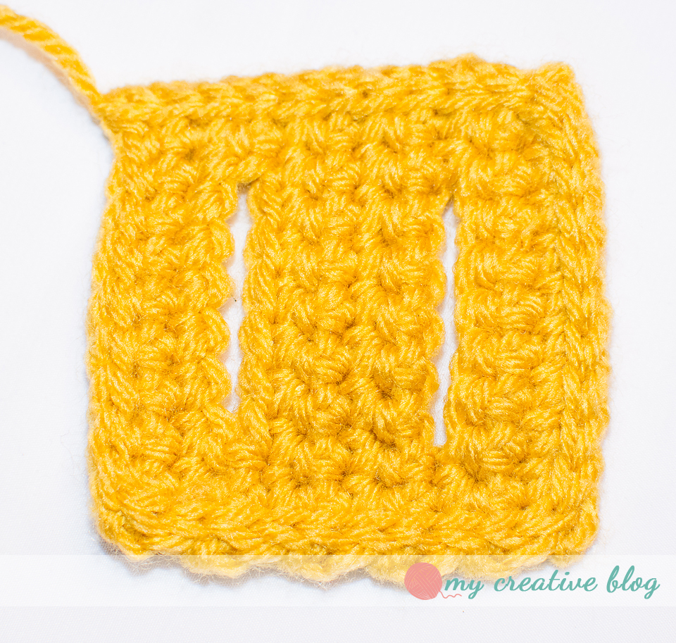 4 [dc + ch 1] x 7 rows in Moss Stitch = 2″ x 2″