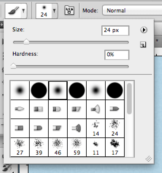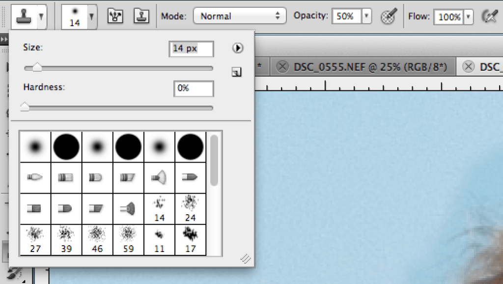 We will need to change the brush size and type. Select “Soft Round” for the type and a brush size that is small enough to give you the detail you need when zoomed in on your image. The “Soft Round” brush type is good because it blurs at the edge so it’s less defined as the “Hard Round” and is better for blending.