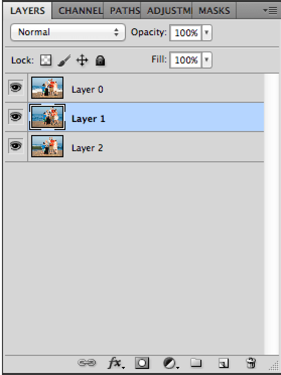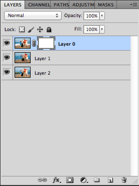 Next we need to apply a layer mask to the top layer. Make sure your top layer is selected and click on the button at the bottom of the layer tab beside the “fx’ button, the one that looks like a circle in a square.