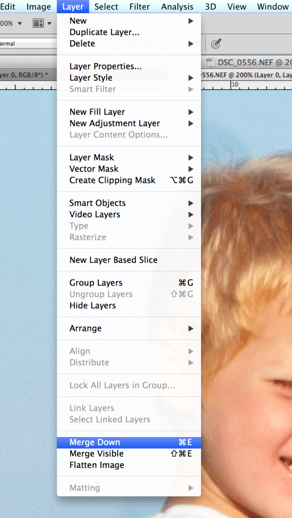 Even after switching back and forth on your brush colors on the mask layer, you may still need to do some touch up. The background of the layer behind may not perfectly match up to the top layer background. Have no fear! Just get it as close as possible then we will come in with another magical tool called the Clone Stamp Tool. First lets merge our two layers. With the top layer selected, select “Layer” from the Photoshop menu and select “Merge Down”. Now these two layers should become one.