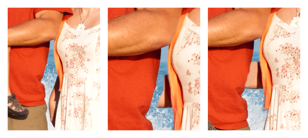 Now it is time for our magical “Clone Stamp Tool”. Select this tool in the left-hand toolbar and like the brush tool, we will need to select an appropriate size and type. Also, like the brush tool, I try to get the smallest size I can to get the detail and also select the “Soft Round” brush type. For this tool, I also change the opacity or the flow to 50% to make blending easier. To use this tool, you hold down the alt button and select the area you would like to copy over, an area from the main layer. Then you use it like the brush tool and paint the area you wish touch up with your sample point previously selected. The Clone Stamp Tool can also be useful for retouching other areas such as facial blemishes.