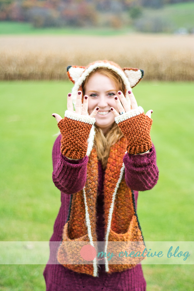 How about some fingerless gloves to go with the Firestorm Fox Scoodie pattern from last week. These fingerless gloves use the same texture as the Fox Scoodie, so they are a great compliment to it. To keep the gloves from being too thick, however, these gloves are made with worsted weight yarn instead of bulky weight like the Fox Scoodie.