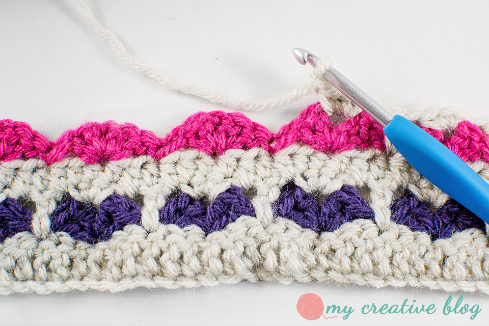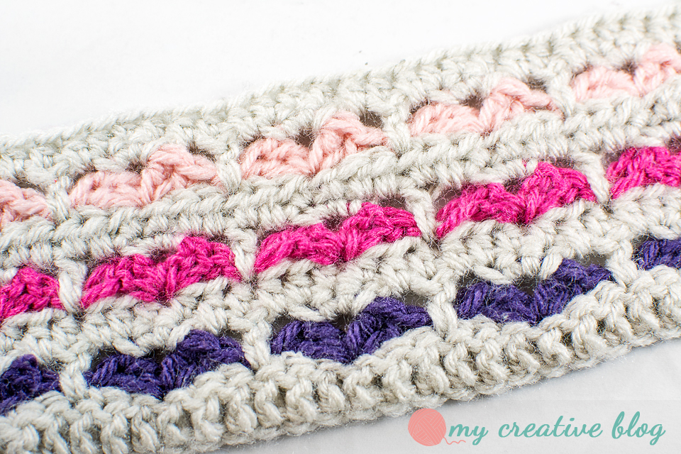 Row 5-10: Repeat rows 2-4 twice. Alternatively, skip working rows 5-10 for a fun headband.