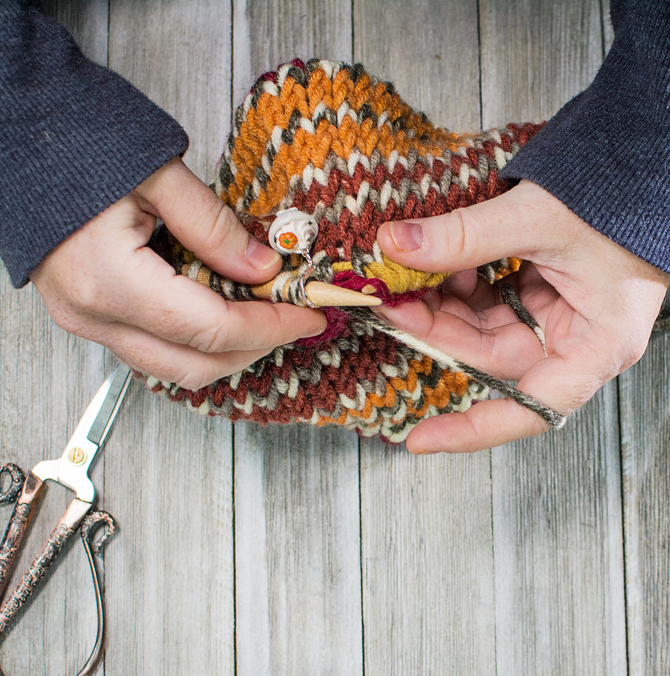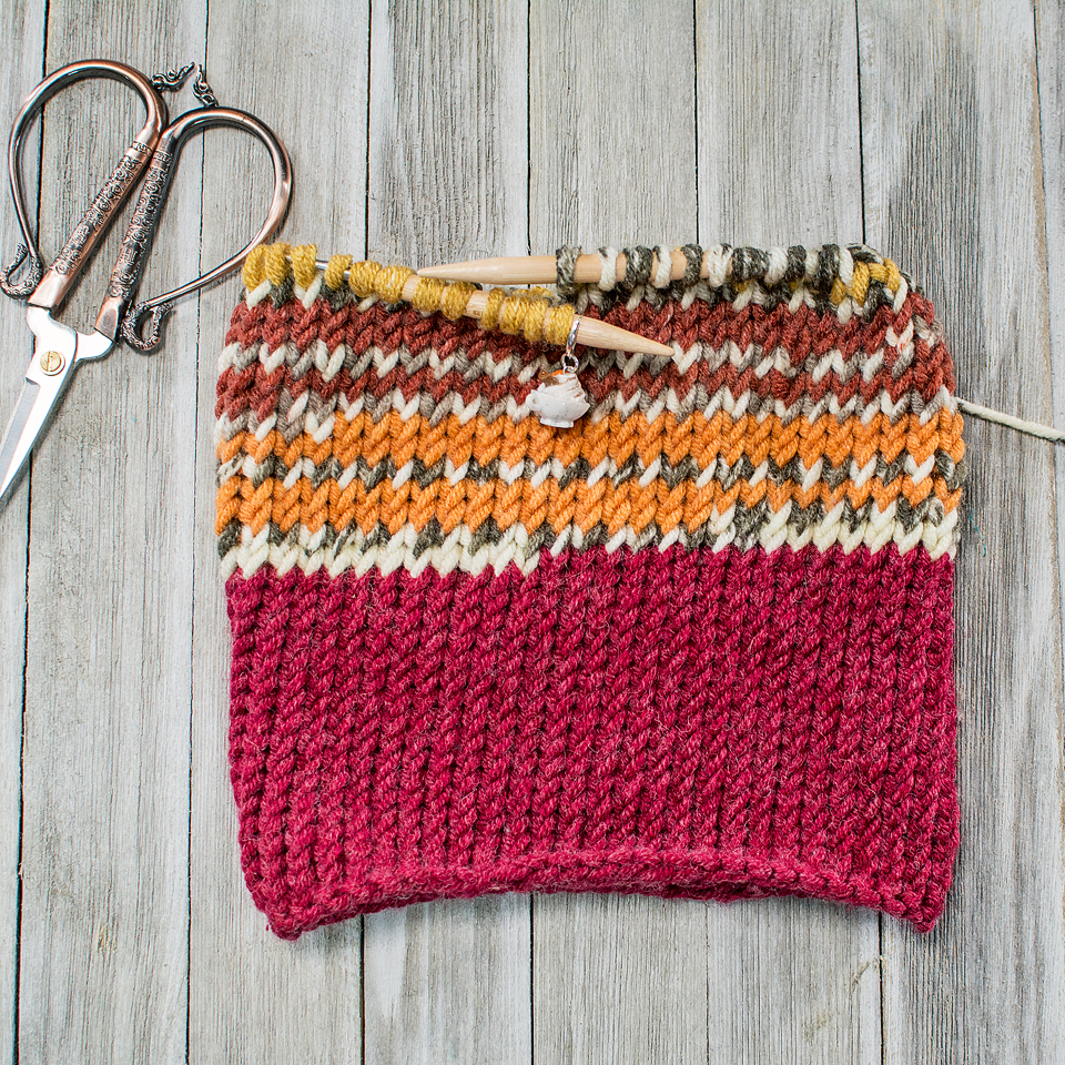 With color B and US 11 needles, cast on 54 stitches. Join to form round.