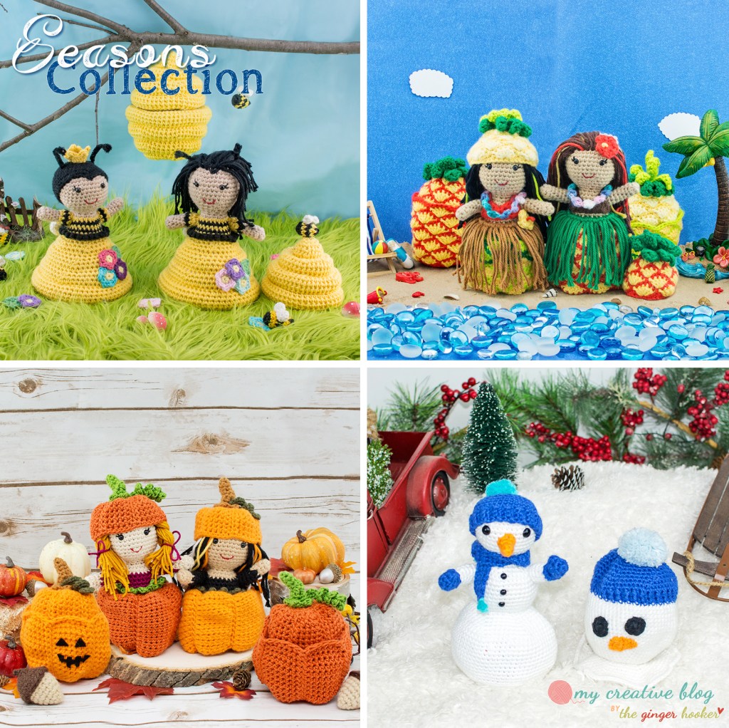 This collection includes the Queen Bee-Hive Doll Pattern, The Hawaiian Pineapple Doll Pattern, The Pumpkin Spice Doll Pattern, and the newly released Melting Snowman Doll Pattern.