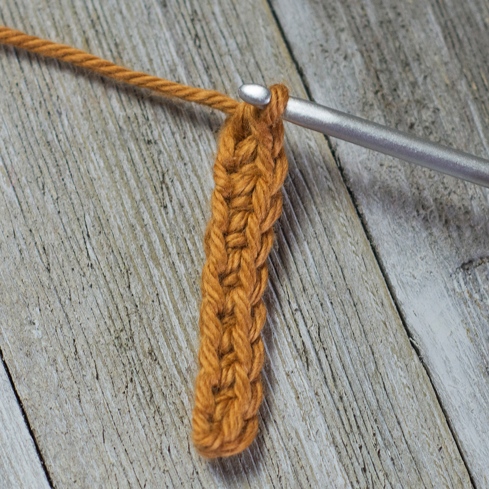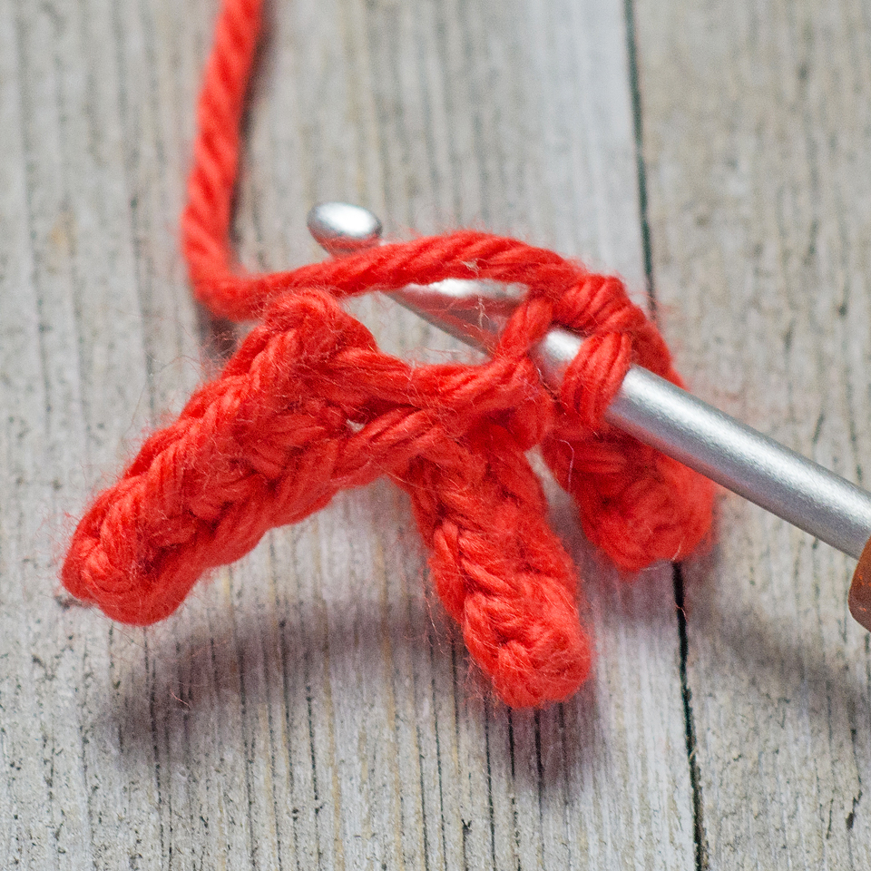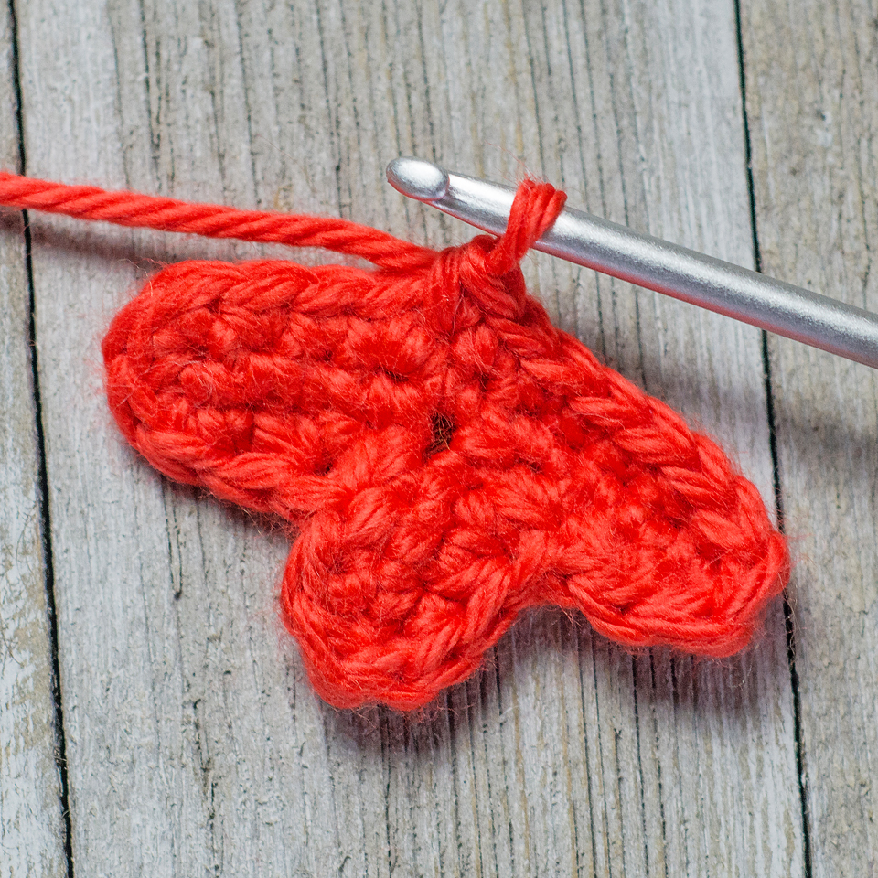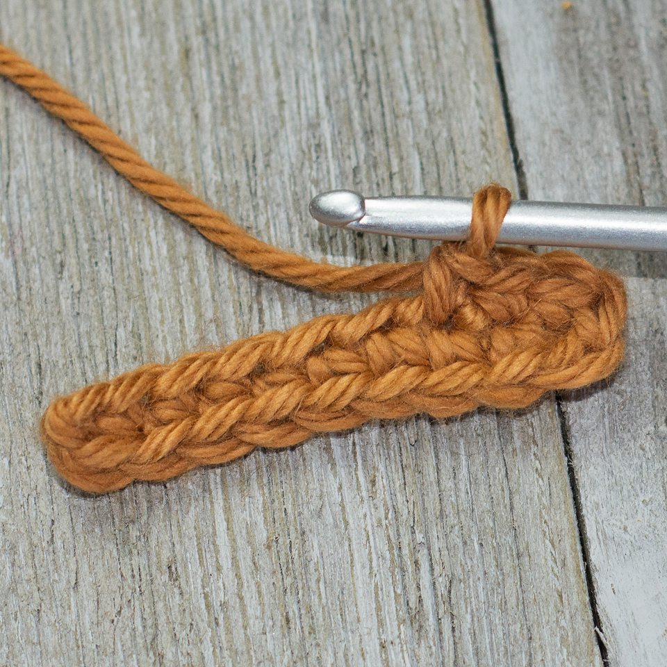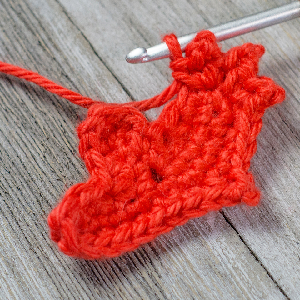 Round 2: Working in back ridge of starting chain, 2 sc in first st, sc in next 5 sts, 2 hdc in next 3 sts, turn and work in scs from round 1, 2 hdc in next 3 sts, sc in next 5 sts, 2 sc in last st. (26)
