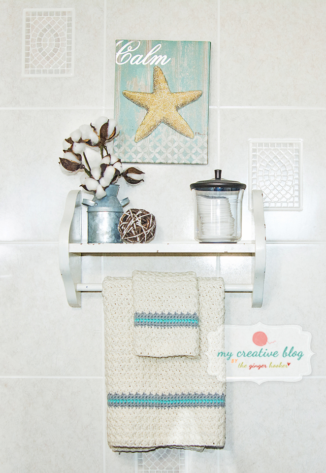So I made these beautiful washcloths nearly a year ago for a friend’s bridal shower. I thought they were a very elegant bridal gift. I gifted her a set of 4 and wrote down the pattern as I so often do. Fast forward several months, and I thought a matching towel would be a great addition. So I decided to whip up another set of washcloths and a hand towel for my bathroom.